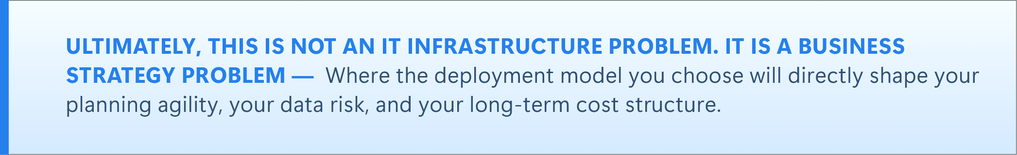 - Control vs Convenience: How much control do you need over planning cycles, data, performance, and recovery timelines? Licensed on-premises provides the most; SaaS provides the least. The more critical the planning cycle to your business outcomes, the stronger the case for retaining control.
