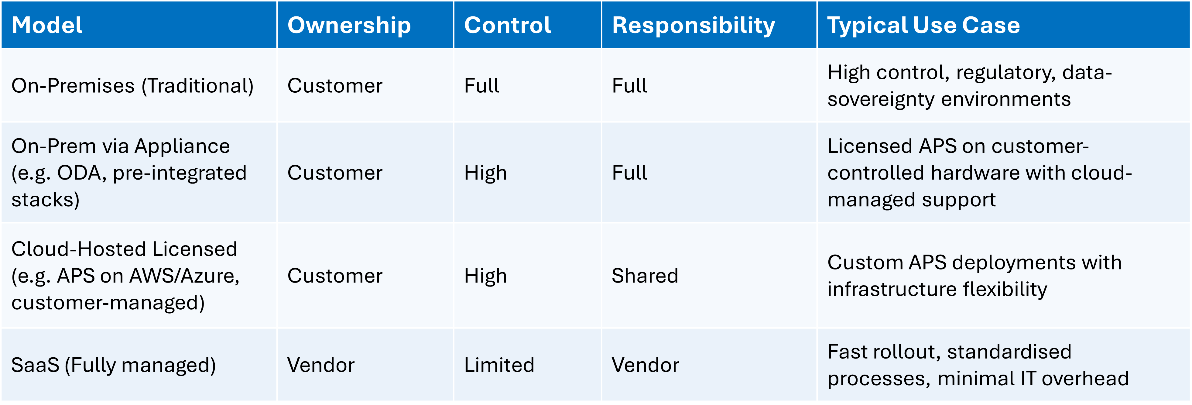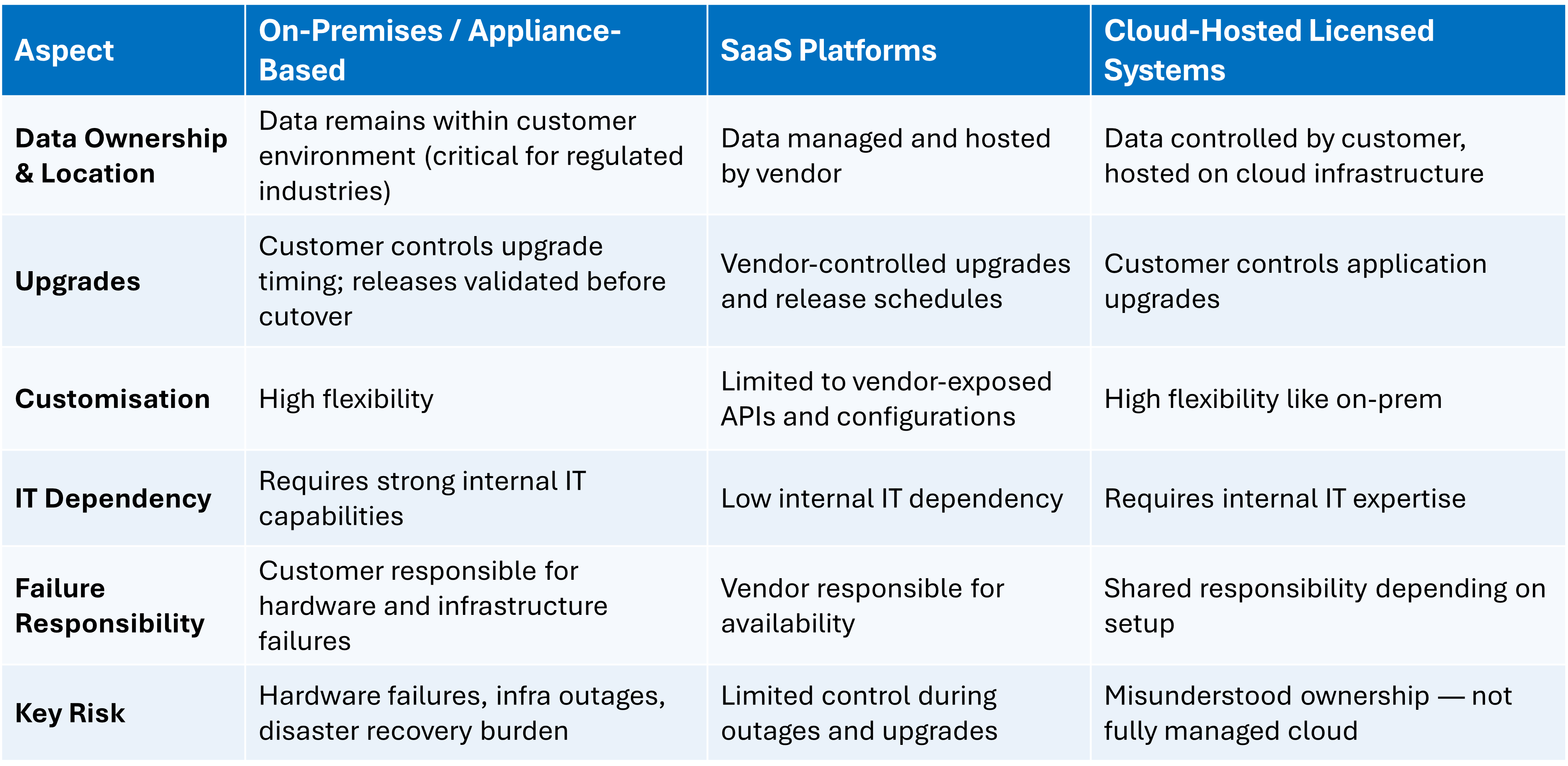 Cloud is not inherently superior. On-premises is not inherently outdated. SaaS is not inherently risk-free. Each model optimises for a different set of priorities. The organisations that get this right are not the ones that followed the prevailing trend — they are the ones that matched their deployment model to their actual operational requirements.