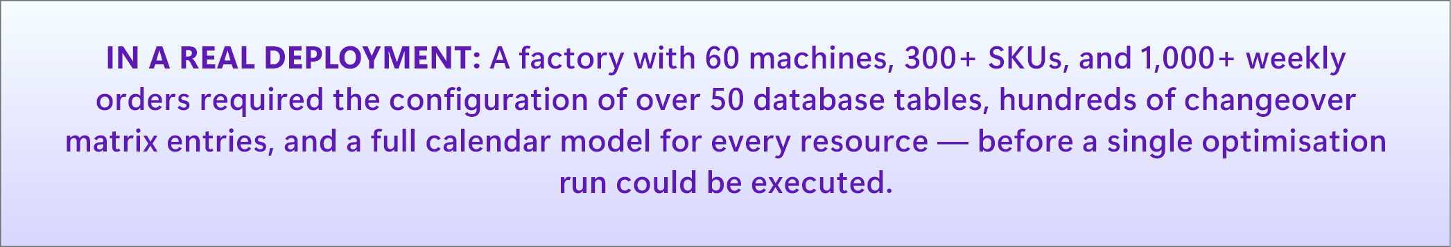 - The Algorithm Calibration Problem: Even once the model is built, the optimiser needs tuning. How many perturbations should it run? What is the right balance between on-time delivery and changeover cost? How much weight should late orders carry versus idle time penalties? These are not software settings you look up in a manual. They are judgment calls made by someone who understands both the maths and the manufacturing context.