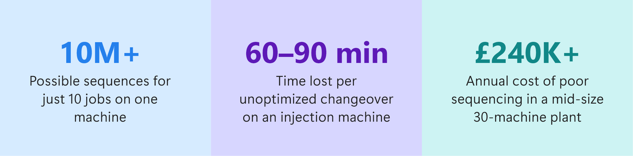 Changeover Matrix Intelligence: Not all changeovers are equal. Switching from Product A to Product B on a machine might take 20 minutes. Switching from B back to A might take 90 minutes, because you are going in the harder direction. Sequencing tools models the full matrix of transition costs between every product pair on every machine — and sequences jobs to travel the cheapest path through that matrix.