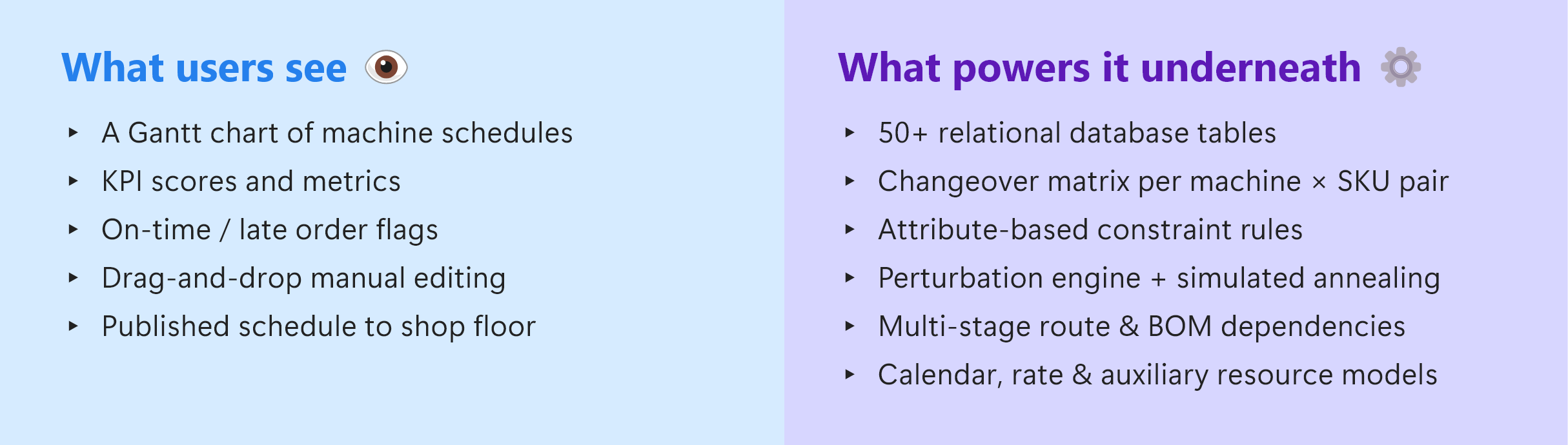 Here is what people see when they look at a sequencing tool: a Gantt chart, some KPI scores, and a published schedule. Clean. Impressive. Looks straightforward. Here is what sits underneath that interface:
