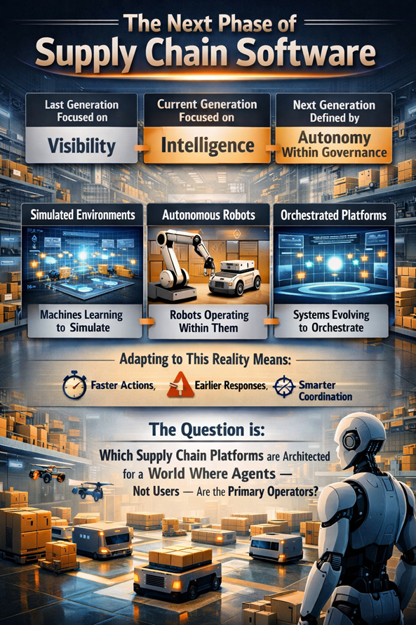 The last generation of supply chain software focused on visibility. The current generation focuses on intelligence. The next generation will be defined by autonomy within governance. Machines are learning to simulate environments. Robots are learning to operate within them. And supply chain platforms are evolving to orchestrate both.