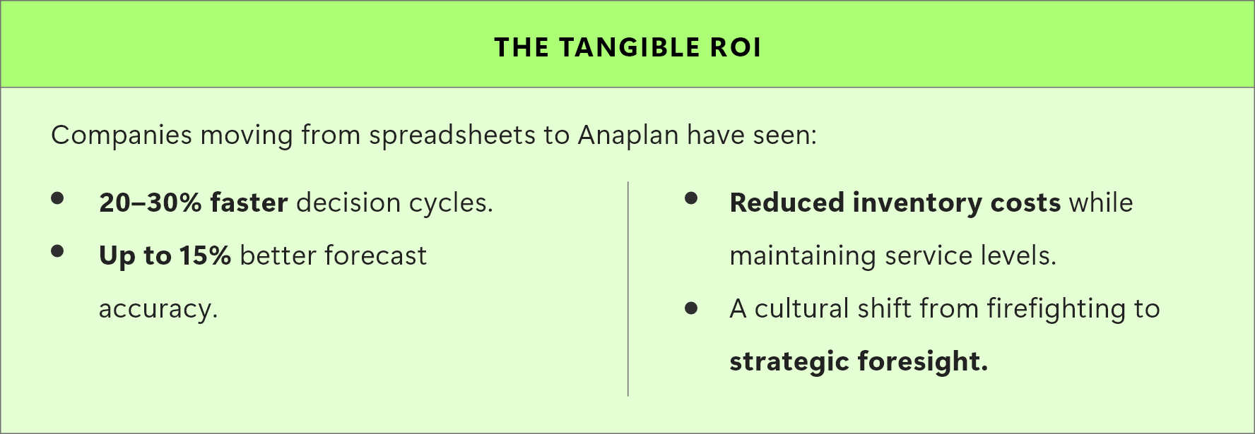 If spreadsheets are like navigating with a paper map, Anaplan is Waze for your supply chain — live traffic, alternate routes, predictive alerts.